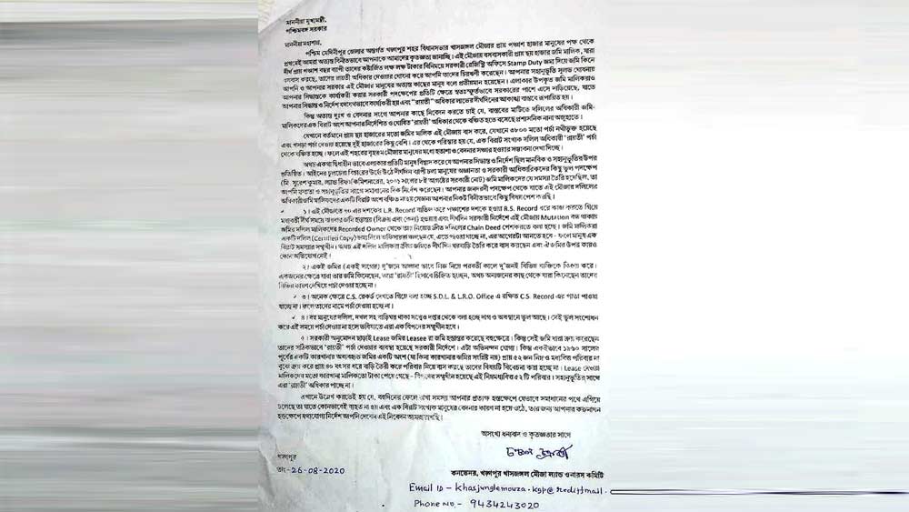খড়্গপুর খাসজঙ্গল মৌজা জমি মালিক কমিটির আহ্বায়ক চঞ্চল চক্রবর্তী বলেন, “মুখ্যমন্ত্রী বসবাসকারী সকলকে জমির রায়তি স্বত্ব ফিরিয়ে দিতে বলেছেন। কিন্তু নানা অজুহাতে শুনানিতে অনেককে পরচা দেওয়া হবে না বলে জানানো হয়েছে। আমরা বিষয়টি মুখ্যমন্ত্রীর নজরে আনতে চাইছি। বিধায়ককেও জানিয়েছি।” খড়্গপুরের বিধায়ক প্রদীপ সরকারের আশ্বাস, “আমি মুখ্যমন্ত্রীর কাছে বিষয়টি তুলে ধরব।”