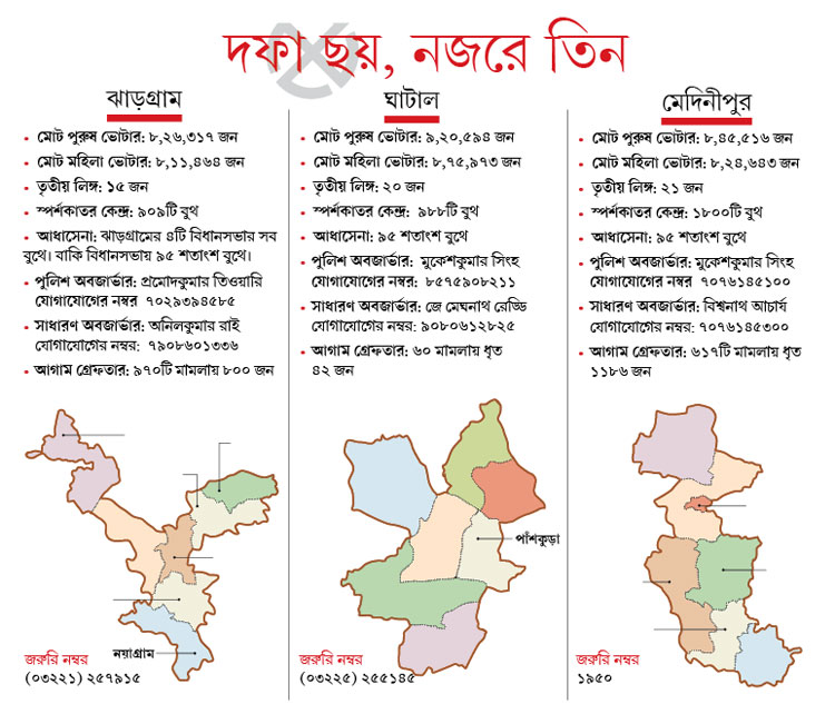 কমিশনের তরফে পুলিশকে জানানো হয়েছে, কেন্দ্রীয় বাহিনীকে যাতে ভোটের দিনে কোথাও বসিয়ে রাখা না হয়, সেই নির্দেশও দেওয়া হয়েছে। প্রতি কোম্পানি থেকে ৯ সেকশন বা ৭২ জন জওয়ানকেই যাতে ভোটের কাজে ব্যবহার করা হয় পুলিশকে তা দেখার নির্দেশ দেওয়া হয়েছে। মেদিনীপুর লোকসভা কেন্দ্রে ক্যাম্পাসে একটিই বুথ রয়েছে, এমন বুথের সংখ্যা ১,১৭৮। দু’টি বুথ রয়েছে, এমন বুথের সংখ্যা ২৩৬। তিনটি বুথ রয়েছে, এমন বুথের সংখ্যা ৩৬। অন্য দিকে, ঘাটাল লোকসভায় ক্যাম্পাসে একটিই বুথ রয়েছে, এমন বুথের সংখ্যা ১,৫১৩। দু’টি বুথ রয়েছে, এমন বুথের সংখ্যা ২৬৮। তিনটি বুথ রয়েছে, এমন বুথের সংখ্যা ৭। বুথের মধ্যে কেউ ভোটারদের উপর প্রভাব খাটাচ্ছেন কিনা, সে দিকে নজর রাখবেন মাইক্রো অবজার্ভার। পশ্চিম মেদিনীপুরে মোট ১,৯৮৮ জন মাইক্রো অবজার্ভার থাকছেন বলে জেলা প্রশাসনের এক সূত্রে খবর। জেলার একশো শতাংশ বুথেই বাহিনী থাকবে। সাধারণত, বুথে কেন্দ্রীয় বাহিনী থাকলে সেখানে সিসি ক্যামেরা, ওয়েব কাস্টিং বা মাইক্রো অবজার্ভার রাখা হয় না। নির্বাচন কমিশনের এক সূত্র জানাচ্ছে, ২০১৬- র বিধানসভা ভোটে কেন্দ্রীয় বাহিনীর বিরুদ্ধেও বিভিন্ন ধরনের অভিযোগ এসেছিল। তাই কেন্দ্রীয় বাহিনী থাকলেও নজরদারি রাখা হচ্ছে।