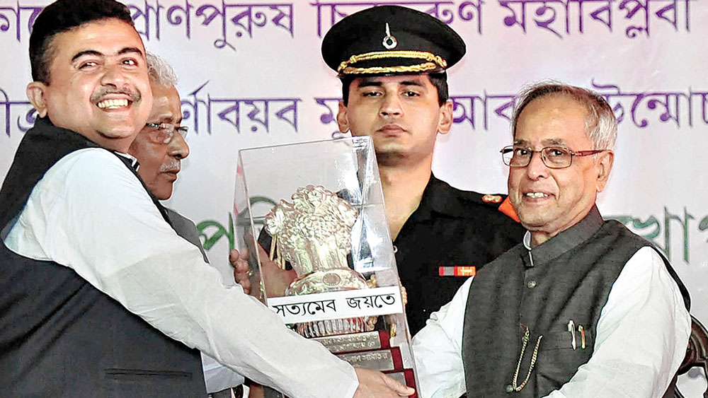 রাষ্ট্রপতি থাকাকালীন ২০১৩ সালে ফের তমলুকে। সঙ্গে তৃণমূল নেতা শিশির এবং শুভেন্দু অধিকারী। ফাইল চিত্র