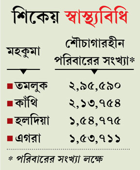 প্রতিটি বাড়িতে শৌচাগার তৈরির জন্য এর আগে একাধিকবার অভিযান চালানো হয়েছে। প্রতিটিতে বাড়িতে শৌচাগার তৈরির জন্য একাধিকবার অভিযান চালানো হলেও পূর্ব মেদিনীপুর জেলায় এখনও পর্যন্ত প্রায় ২ লক্ষের বেশি পরিবারের নিজস্ব শৌচাগার নেই। জেলায় প্রায় ৮ লক্ষ ১৭ হাজার পরিবার রয়েছে। তার মধ্যে এত বিশাল সংখ্যক পরিবারে শৌচাগার না থাকায় প্রশ্নের মুখে গ্রামীণ স্বাস্থ্য সচেতনতা। এর ফলে সরকারিভাবে পূর্ব মেদিনীপুরের ‘নির্মল জেলা’র স্বীকৃতি পাওয়া নিয়েও সংশয় তৈরি হয়েছে।
