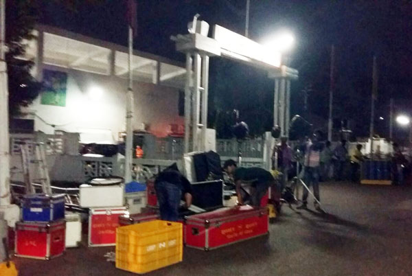 রাতেও শুটিং চলছে সেরসা স্টেডিয়ামে। —নিজস্ব চিত্র।