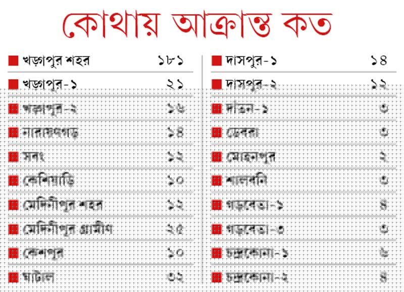 পশ্চিম মেদিনীপুরে এখনও পর্যন্ত ডেঙ্গি আক্রান্তের সংখ্যা ৪০৮।পরিসংখ্যান ব্লক ভিত্তিক (সূত্র: জেলা স্বাস্থ্য দফতর)