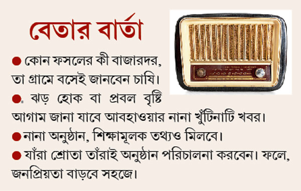 প্রত্যন্ত এলাকায় এই ছবি নতুন নয়। তবে এই সব সমস্যা থেকে এ বার মুক্তি পেতে চলেছেন শালবনির চাষিরা। সৌজন্যে কমিউনিটি রেডিও সেন্টার। এটি তৈরি হলে শুধু চাষের প্রয়োজনীয় বাজার বা আবহাওয়ার খবর নয়, সমাজ-সংস্কৃতি-নানা শিক্ষামূলক বিষয় সম্পর্কেও জানতে পারবেন গ্রামবাসী। শালবনির বিধায়ক শ্রীকান্ত মাহাতোর এলাকা উন্নয়ন তহবিলের টাকাতেই এই সেন্টার গড়ে উঠবে। ইতিমধ্যে বিধায়কের প্রস্তাব অনুমোদন করেছে জেলা প্রশাসন। শীঘ্রই কাজ শুরু হবে। শালবনির বিধায়ক শ্রীকান্তবাবু বলেন, ‘‘রেডিও সেন্টার চালু হলে গ্রামবাসীই উপকৃত হবেন। তাঁরা অনেক প্রয়োজনীয় তথ্য জানতে পারবেন।’’ জেলা প্রশাসনের এক কর্তারও বলেন, “রেডিও চালু হলে চাষি খেতে কাজ করতে করতে নানা খবরাখবর পেয়ে যাবেন।”