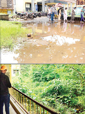 খড়্গপুর মহকুমা হাসপাতালের বহির্বিভাগে জল পেরিয়েই যাতায়াত (উপরে)। বহির্বিভাগ ভবন চত্বর ঢেকেছে আগাছায় (নীচে)। ছবি: সৌমেশ্বর মণ্ডল, রামপ্রসাদ সাউ।