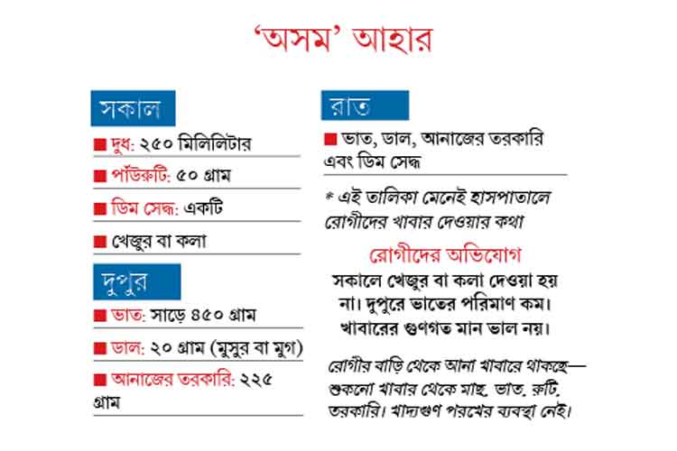 হলদিয়া মহকুমা হাসপাতালে রোগীদের যে খাবার দেওয়া, তা পর্যাপ্ত নয় বলে অভিযোগ করেছেন বহু রোগীই। হাসপাতাল সূত্রের খবর, রোগীদের খাদ্য তালিকায় রয়েছে— দুপুরে প্রাপ্ত বয়স্কদের জন্য সাড়ে ৪৫০ গ্রাম ভাত, ২০ গ্রাম মুসুর বা মুগ ডাল, আনাজের তরকারি ২২৫ গ্রাম এবং ৫০ গ্রামে মাছ। এছাড়া, সকালে জল খাবারে ২৫০ মিলিলিটার দুধ, ৫০ গ্রাম পাউরুটি, একটি ডিম সেদ্ধ এবং খেজুর বা কলা দেওয়ার কথা। রাতের খাদ্য তালিকায় রয়েছে— ভাত, ডাল, আনাজের তরকারি এবং ডিম সেদ্ধ। কিন্তু হলদিয়া মহকুমা হাসপাতালে জল খাবারে খেজুর বা কলা কোনওটাই জোটে না বলে অভিযোগ রোগীদের।