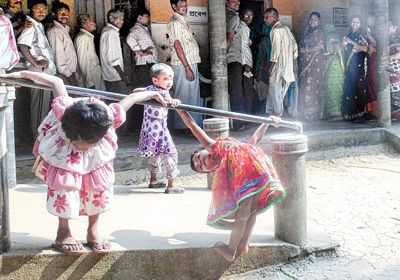 ভোটকেন্দ্রে দাঁড়িয়েই খেলায় মত্ত তিন খুদে। দাসপুর-২ ব্লকে তোলা নিজস্ব চিত্র।