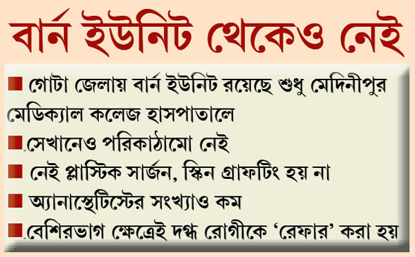 মেদিনীপুর মেডিক্যাল ছাড়া পশ্চিম মেদিনীপুরের আর কোনও হাসপাতালে বার্ন ইউনিট নেই। আগে মেদিনীপুর মেডিক্যালেও ছিল না। সম্প্রতি চালু হয়েছে। নয়াগ্রাম, ঝাড়গ্রাম, ঘাটাল, গোপীবল্লভপুরে গড়ে ওঠা সুপার স্পেশ্যালিটি হাসপাতালেও নেই বার্ন ইউনিট। পশ্চিম মেদিনীপুরের জেলা মুখ্য স্বাস্থ্য আধিকারিক গিরীশচন্দ্র বেরা অবশ্য বলেন, ‘‘ঘাটাল, ঝাড়গ্রামে বার্ন ইউনিট চালু হবে। দ্রুত পরিকাঠামো তৈরির কাজ শেষ করে পরিষেবা দেওয়ার চেষ্টা চলছে।”