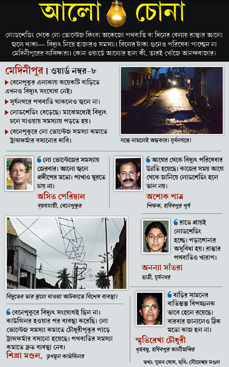 লোডশেডিং থেকে লো ভোল্টেজ কিংবা অকেজো পথবাতি বা দিনের বেলায় রাস্তার আলো জ্বলে থাকা— বিদ্যুৎ নিয়ে হাজারও সমস্যা। বিলের টাকা গুনেও পরিষেবা পাচ্ছেন না মেদিনীপুরের বাসিন্দারা। কোন ওয়ার্ডে আলোর হাল কী, তারই খোঁজে আনন্দবাজার।