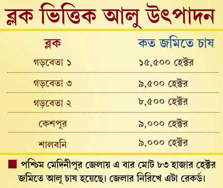 সহায়ক মূল্যে আলু কেনার জন্য ব্লক পিছু ২ লক্ষ টাকা করে বরাদ্দ হয়েছে। আলু কেনা হবে মিড ডে মিল, আইসিডিএসের জন্য। কিন্তু এই বরাদ্দ সামান্য বলেই মত চাষিদের। তাঁদের বক্তব্য, হেক্টরের পর হেক্টর জমিতে আলু চাষ হয়েছে। সেখানে এক-একটি অঞ্চল থেকে ১৫-২০ বস্তা আলু কেনা হলে কার সুবিধে হবে! জেলা কৃষি দফতরের এক আধিকারিকের অবশ্য যুক্তি, “জেলায় যে পরিমান আলু উত্পাদন হয়, তার সবটাই সহায়ক মূল্যে সরকার কিনে নেবে, এমনটা হতে পারে না। সহায়ক মূল্যে আলু কেনা শুরু হলে বাজারে আলুর দাম একটু বাড়ে। চাষিরা তুলনায় একটু বেশি দাম পান।” নামপ্রকাশে অনিচ্ছুক ওই আধিকারিকের কথায়, “সহায়ক মূল্যে সাড়ে পাঁচ টাকা কেজি দরে আলু কেনা হচ্ছে। এখন বাজারে আলুর দাম কেজি প্রতি আড়াই থেকে তিন টাকা। চাষিরা এই দামেই আলু বিক্রি করছেন বলে শুনেছি। সর্বত্র সহায়ক মূল্যে আলু কেনা শুরু হলে বাজারে আলুর দাম কেজি প্রতি সাড়ে তিন থেকে চার টাকা হতে পারে।” শালবনির বাসিন্দা সনাতন মাহাতোর কথায়, “প্রায় পাঁচ বিঘা জমিতে এ বার আলু চাষ করেছি। এখন বাজারে যা দাম তাতে চাষের খরচ উঠবে না।” কেশপুরের বাসিন্দা মলয় দাসও বলেন, “এ বার বেশি দামেই আলু বীজ কিনে চাষ করতে হয়েছে। সারের দাম, কীটনাশকের দামও বেড়েছে। বাজারে আলুর দাম যে ভাবে কমে যাচ্ছে, তাতে চাষের খরচ উঠে আসা মুশকিল।” চাষিদের দাবি, বিঘা প্রতি তাঁদের অন্তত ৫-৬ হাজার টাকা ক্ষতি হচ্ছে। কারও কারও আরও বেশি।