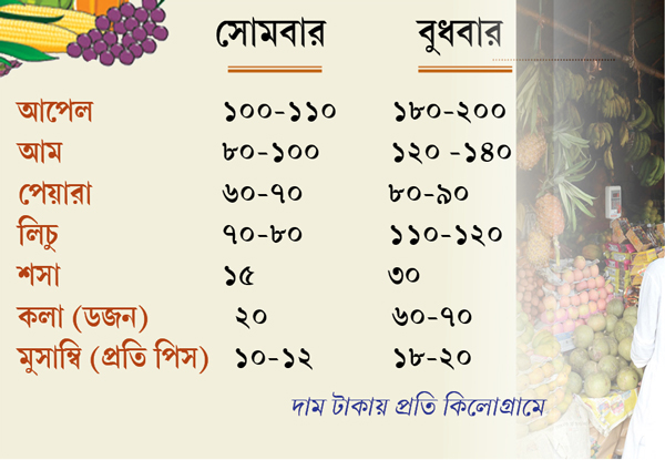 আপেল, কলা, পেয়ারা, পেঁপে, বেদানা, খেজুর, আম কিনতে গিয়ে মেদিনীপুরের অনেক মানুষেরই হাত পুড়ছে। সৈয়দ আব্দুল ফারুক যেমন বললেন, “তিনদিন আগেও প্রতি কিলো ৭০-৮০ টাকায় লিচু পেয়েছি। এখন দাম বলয়েছে ১২০ টাকা!” একই সুরে তালেবুল হোসেনের কথায়, ‘‘১২০ টাকা কিলোর আপেল ছিল এখন ১৮০-২০০ টাকার নীচে পাওয়া যাচ্ছে না। রমজান মাস শুরু হতেই ফলের দাম দেড় থেকে দু’গুণ বেড়ে গিয়েছে। সাধারণ-মধ্যবিত্ত মানুষ ফল কিনবেন কী ভাবে!”