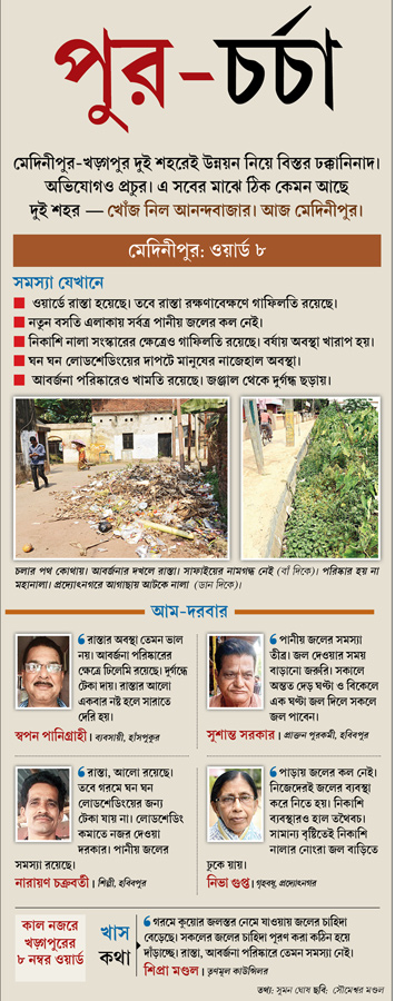 মেদিনীপুর-খরগপুর দুই শহরেই উন্নয়ন নিয়ে বিস্তর চক্কানিনাদ। অভিযোগও প্রচুর। এ সবের মাঝে ঠিক কেমন আছে দুই শহর- খোঁজ নিল আনন্দবাজার। আজ মেদিনীপুর।