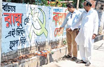 নর্দমার ধারে পড়ে বিজেপির পতাকা।