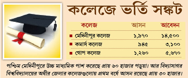 উচ্চ মাধ্যমিকের ফলপ্রকাশের পরে কলেজে ভর্তি প্রক্রিয়া শুরু হয়েছে। কিন্তু জেলায় যত ছাত্রছাত্রী উচ্চ মাধ্যমিক পাশ করেছে, কলেজে কলেজে আসন সংখ্যা তার অর্ধেক। ফলে, সঙ্কট পশ্চিম মেদিনীপুরে।