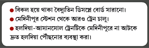 ট্রেনের সময় জানান দিতে মেদিনীপুর স্টেশনের বৈদ্যুতিন ডিসপ্লে বোর্ডটি বেশ কিছুদিন হল খারাপ হয়ে পড়ে রয়েছে। সেটি মেরামত করা, মেদিনীপুর স্টেশন থেকে আরও ট্রেন চালু, হলদিয়া-আসানসোল ট্রেনটিকে মেদিনীপুরে না আটকে দ্রুত হলদিয়া পৌঁছনোর ব্যবস্থা করা-সহ নানা দাবি জানিয়েছিলেন যাত্রীরা। তা নিয়ে খড়্গপুর ডিভিশনের ডিআরএমের সঙ্গে বৈঠকও করেন নিত্যযাত্রীরা। তাঁকে স্মারকলিপি দেন। ডিআরএম আশ্বাসও দিয়েছিলেন, সমস্ত দাবি খতিয়ে দেখবেন তিনি। তার এক সপ্তাহের মধ্যে একটি দাবি পূরণ হল।