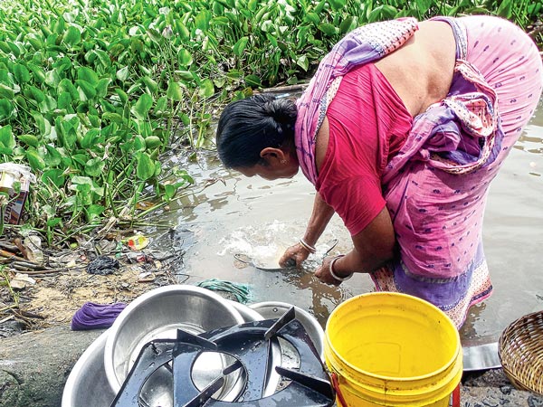 দূষণ: পুকুরের জলেই চলছে বাসন ধোওয়া। ঘাটালে। নিজস্ব চিত্র