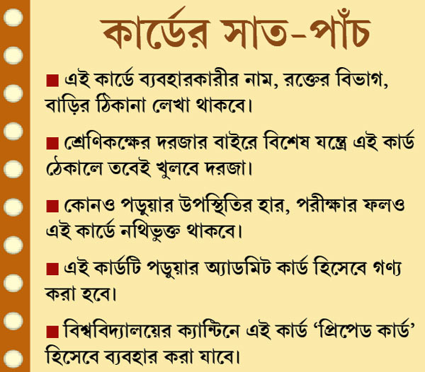 বিশ্ববিদ্যালয়ের এক সূত্রে খবর, স্মার্ট কার্ডে ব্যবহারকারীর নাম, রক্তের বিভাগ, বাড়ির ঠিকানা লেখা থাকবে। বিশ্ববিদ্যালেয়র প্রতিটি শ্রেণিকক্ষের দরজার পাশে লাগানো থাকবে বিশেষ যন্ত্র। ওই যন্ত্রে ‘স্মার্ট কার্ড’ ঠেকালে তবেই খুলবে শ্রেণিকক্ষের দরজা। ক্লাস নেওয়ার জন্য শিক্ষকদেরও এই কার্ড নিয়েই শ্রেণিকক্ষে ঢুকতে হবে। কার্ড ছাড়া শ্রেণিকক্ষ থেকে বেরনোও যাবে না।