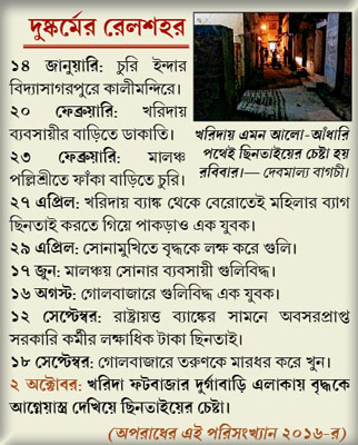 রেলশহর খড়্গপুরে দুষ্কৃতীদের দাপাদাপি লেগেই রয়েছে। ক’দিন আগেই গোলবাজারে দুষ্কৃতীদের মারধরে প্রাণ গিয়েছে এক তরুণের। আর গত কয়েক মাসে ছিনতাইয়ের ঘটনা ঘটেছে একাধিক। সেপ্টেম্বরেই ভবনীপুরের গলির মধ্যে একটি রাষ্ট্রায়ত্ত ব্যাঙ্কের সামনে স্কুল শিক্ষা দফতরের অবসরপ্রাপ্ত এক কর্মীর টাকা ছিনতাই হয়। গত ১৭ জুন মালঞ্চ টাটা ব্যাঙ্কের কাছে বাড়িতে ঢোকার আগে গুলিবিদ্ধ হয়েছিলেন এক স্বর্ণ ব্যবসায়ী। সে দিন দুষ্কৃতীদের গুলিতে জখম হন এক কাঠমিস্ত্রিও। এ বার দুর্গাপুজোর চারদিন আগে ফের ছিনতাইয়ের অভিযোগে শহরের নিরাপত্তা নিয়ে আতঙ্কিত বাসিন্দারা। রাতেই থানায় গিয়েছিলেন স্থানীয় কাউন্সিলর দেবাশিস চৌধুরী। এই এলাকাতেই বাড়ি খড়্গপুরে পুরপ্রধান প্রদীপ সরকারের। তিনিও বলেন, “বাড়ির সামনে এমন ঘটনা ঘটায় আমি নিজেও শঙ্কিত। যে কারও সঙ্গেই তো এমন ঘটনা ঘটতে পারে। আমি নিজে পুলিশের সঙ্গে কথা বলেছি।”