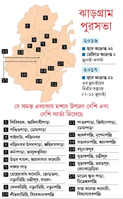 পুরসভা সূত্রে দাবি, মে মাসে প্রথম দফার সমীক্ষায় ১৮টি ওয়ার্ডে ১৯ হাজার ৭৪৭টি চৌবাচ্চা, জলভর্তি পাত্র-সহ বিভিন্ন জলপূর্ণ আধার পরীক্ষা করা হয়। এর মধ্যে ২০৭টি জায়গায় মশার লার্ভা মিলেছিল। এরপর নিয়মিত স্বচ্ছ জমা জল পরিষ্কার এবং মশানাশক স্প্রে করার ফলে পরিস্থিতির অনেকটাই উন্নতি হয়েছে। জুন মাসে দু’টি পর্যায়ে ৩১ হাজার ৬২২টি জমা জলের জায়গা ও পাত্র পরীক্ষা করে ৪৫টি জায়গায় মশার লার্ভা মেলে। কিন্তু জুলাইয়ের প্রথম সপ্তাহে মাত্র পাঁচ দিনে (৭-১১ জুলাই) ১৮টি ওয়ার্ডে ১৪ হাজার ৬৪টি পরিষ্কার জমা জলের জায়গা পরীক্ষা করে ৬৯টি জলাধার ও পাত্রে মশার লার্ভা পাওয়া গিয়েছে। সব ক্ষেত্রে মশা নাশক স্প্রে করা হয়েছে। পুর তথ্য অনুযায়ী, গত বছর বর্ষায় ঝাড়গ্রাম শহরে জ্বরে আক্রান্ত হন ৬২ জন। ডেঙ্গি ধরা পড়েছিল দু’জনের। এবার জুলাইয়ের দ্বিতীয় সপ্তাহেই শহরে জ্বরে আক্রান্তের সংখ্যা ৪১। যদিও পুরসভা ও স্বাস্থ্য দফতর সূত্রের দাবি, এখনও কারও ডেঙ্গি ধরা পড়েনি।