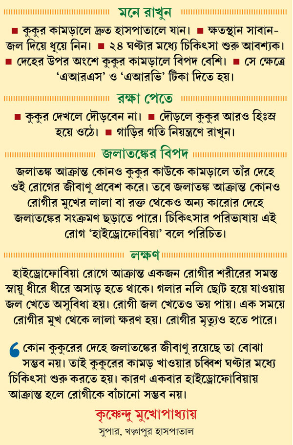 খড়্গপুর মহকুমা হাসপাতাল সূত্রে জানা গিয়েছে, এখন প্রতি সপ্তাহে প্রায় ৪০ জন কুকুর কামড়ের টিকা নেন। তাঁদের অধিকাংশই খড়্গপুর শহরের বাসিন্দা। চিকিৎসকেরা জানাচ্ছেন, রাস্তার কুকুরদের নিয়মিত টিকাকরণ না হওয়ায় অনেক সময় জলাতঙ্ক রোগের প্রকোপ দেখা যায়। চিকিৎসার পরিভাষায় এই রোগ ‘হাইড্রোফোবিয়া’ বলে পরিচিত। এই রোগে মানুষের মৃত্যু অনিবার্য। জলাতঙ্ক আক্রান্ত রোগীর রোগীর মুখের লালা বা রক্ত থেকে অন্য একজনের দেহেও জলাতঙ্কের জীবাণু ছড়িয়ে পড়তে পারে।