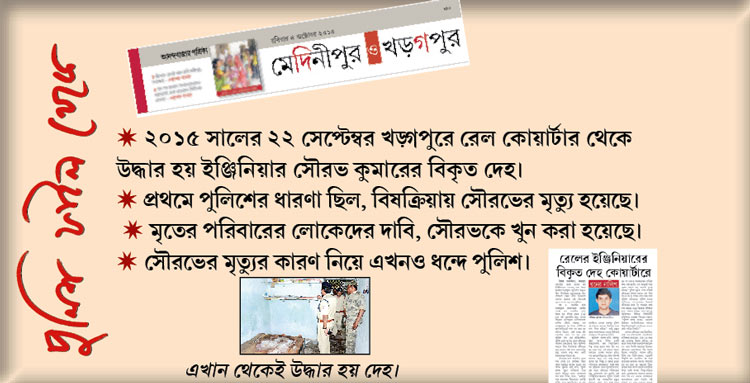 ২২ সেপ্টেম্বর, ২০১৫। খড়্গপুর গোলবাজার মসজিদ সংলগ্ন রেল কোয়ার্টারের ঘটনা। বিহারের অখিলাবাদের বাসিন্দা সৌরভ খড়্গপুরে রেল কারখানার চিফ ডিপো মেটেরিয়াল সুপারিন্টেনডেন্ট পদে কর্মরত ছিলেন। প্রাথমিক তদন্তে পুলিশের দাবি ছিল, বিষক্রিয়ায় সৌরভের মৃত্যু হয়েছে। সেই মতো অস্বাভাবিক মৃত্যুর মামলা রুজু করে তদন্তও শুরু করে পুলিশ।