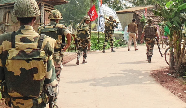 সামনে উপ নির্বাচন। তমলুকের নেতাজি নগরে কেন্দ্রীয় বাহিনীর টহল। পার্থপ্রতিম দাসের তোলা ছবি।