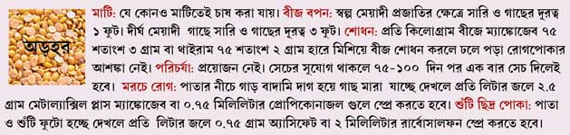 কৃষি দফতর সূত্রে খবর, অড়হর ডালের বীজের দাম কিলোগ্রাম প্রতি ৩০-৩৫ টাকা। বিঘা প্রতি তিন থেকে সাড়ে তিন কিলোগ্রাম বীজ লাগে। জ্যৈষ্ঠ্য-আষাঢ় মাস বা আশ্বিন মাস, দুই সময়েই অড়হর চাষ করা যায়। বিঘা প্রতি ফলন ১৭৫ -২২৫ কিলোগ্রাম। অড়হরের দেশি প্রজাতির গাছ এক বার লাগালে ৪-৫ বছর ফলন পাওয়া যায়। গাছ কিছুটা বড় হলে তার থেকে জ্বালানিও মেলে। উন্নত প্রজাতির (শ্বেতা, চুর্ণী, জাগৃতি) অড়হর লাগালে ফলন পেতে ১৮০ দিন সময় লাগে। দু’মাসে ফলন পাওয়া যায়, এমন গাছও (টিএটি-১০, প্রভাত, পুসা আগেতি প্রভৃতি) রয়েছে। তবে সে ক্ষেত্রে গাছ ছোট হবে। বাজারে প্রতি কেজি অড়হর ডালের দাম ৩০-৩৫ টাকা। ফলে চাষিদের লাভের পরিমাণ কিছুটা হলেও বাড়বে। অনুর্বর জমিতে চাষ করলে সার দিতে হবে। একর প্রতি ১২ কিলোগ্রাম নাইট্রোজেন, ২৪ কিলোগ্রাম ফসফেট, ২৪ কিলোগ্রাম পটাশ লাগে। তবে সাধারণত চাষিরা সার দেন না। আগে যে ধান বা অন্য কিছু চাষ করেছিল, তার উর্বরতা থেকেই ডাল চাষ হয়ে যায়।