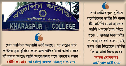 বিদ্যাসাগর বিশ্ববিদ্যালয়ের অধীন সব কলেজেই এ বার অনলাইনে ভর্তি প্রক্রিয়া চলছে। খড়্গপুর কলেজও তার ব্যতিক্রম নয়। তাহলে কী ভাবে চলছে এই টাকা নেওয়ার চক্র?