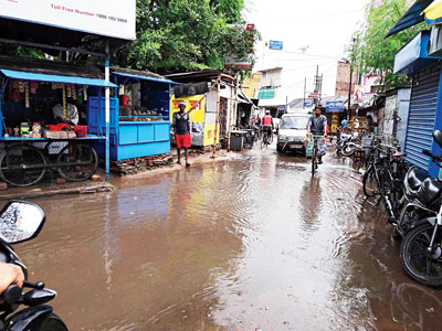 এক পশলা বৃষ্টি হয়েছে কি হয়নি, ভাসছে শহর মেদিনীপুর। গলিপথ জলবন্দি। বড় রাস্তাতেও বইছে স্রোত। আধ ঘন্টার বৃষ্টিতেই যানবাহন বন্ধের জোগাড়।