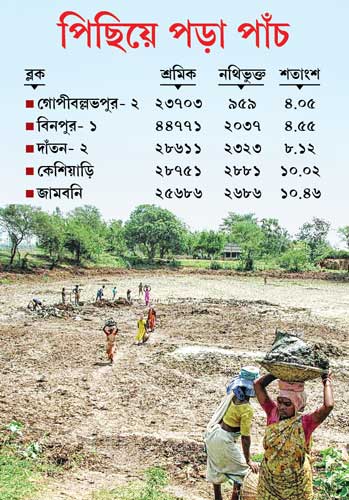 যে ১৭টি ব্লকে কাজে গতি নেই সেগুলি হল— বিনপুর-১, বিনপুর-২, চন্দ্রকোনা-১, দাঁতন-১, দাঁতন-২, গড়বেতা-১, গড়বেতা-২, গোপীবল্লভপুর-১, গোপীবল্লভপুর-২, জামবনি, কেশিয়াড়ি, কেশপুর, খড়্গপুর-১, মোহনপুর, নয়াগ্রাম, পিংলা এবং শালবনি। এই সব ব্লকগুলোর কারও ৪.০৫ শতাংশ কাজ এগিয়েছে! কারও ৪.৫৫ শতাংশ কাজ এগিয়েছে! কারও বা ৮.১২ শতাংশ কাজ এগিয়েছে! পরিস্থিতি দেখে ব্লকগুলোকে এ কাজে গতি আনার লিখিত নির্দেশও দিয়েছেন একশো দিনের কাজ প্রকল্পের ডিস্ট্রিক্ট নোডাল অফিসার মদনমোহন ভট্টাচার্য। নামপ্রকাশে অনিচ্ছুক এক বিডিও-র কথায়, “কিছু ক্ষেত্রে সমস্যা হচ্ছে। পরিকাঠামো দুর্বল হলে তো সমস্যা হবেই! তবে সমস্যার সমাধানে প্রয়োজনীয় পদক্ষেপও করা হচ্ছে।”