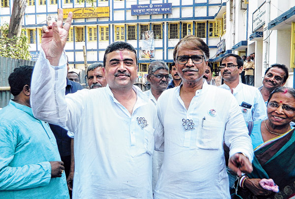 হলদিয়ায় একসঙ্গে দুই তৃণমূল প্রার্থী শুভেন্দু অধিকারী ও সুদর্শনঘোষ দস্তিদার। ছবি: পার্থপ্রতিম দাস, আরিফ ইকবাল খান।