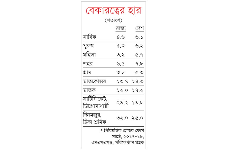 কেন্দ্রীয় পরিসংখ্যান মন্ত্রকের সদ্য প্রকাশিত সমীক্ষা বলছে, ২০১৭-১৮-য় দেশে বেকারত্বের হার ছিল ৬.১ শতাংশ। যা ৪৫ বছরে সর্বোচ্চ। সেই তুলনায় পশ্চিমবঙ্গে বেকারত্বের হার অনেকটাই কম— ৪.৬ শতাংশ। বড় রাজ্যগুলির মধ্যে তামিলনাড়ু, পঞ্জাব, তেলঙ্গানা, হরিয়ানা, উত্তরাখণ্ড, উত্তরপ্রদেশ, কেরল, ঝাড়খণ্ড, অসম, ওড়িশার মতো ১১টি রাজ্যে বেকারত্বের হার জাতীয় গড়ের থেকে বেশি। শুধু সার্বিক ভাবে নয়, পুরুষ ও মহিলাদের মধ্যে রাজ্যের বেকারত্বের হারও জাতীয় গড়ের তুলনায় কম। শহর এবং গ্রামেও রাজ্যে বেকারত্বের হার কম।