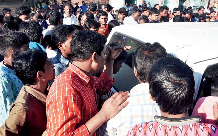 ভিড়: গাড়ির ভিতরে নিথর দেহ। বাইরে উৎসুক পড়শিরা। বৃহস্পতিবার। ছবি: অভিজিৎ সিংহ