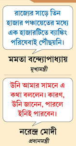 বলটা প্রথম ছুড়েছিলেন মুখ্যমন্ত্রীই। ব্যাঙ্ক পরিষেবাকে দেশের প্রতিটি বাড়ির দরজায় নিয়ে যাওয়াকে তাঁর সরকারের অন্যতম মূল লক্ষ্য হিসেবে তুলে ধরেছেন প্রধানমন্ত্রী নরেন্দ্র মোদী। চালু করেছেন বিনা আমানতে ব্যাঙ্ক অ্যাকাউন্ট খোলার জনধন প্রকল্প। কিন্তু এ দিন নজরুল মঞ্চে দু’টি বিমা এবং একটি পেনশন প্রকল্পের উদ্বোধনী অনুষ্ঠানে মমতার কটাক্ষ, ‘‘রাজ্যের সাড়ে তিন হাজার গ্রাম পঞ্চায়েতের মধ্যে এক হাজারটিতে ব্যাঙ্কিং পরিষেবাই পৌঁছয়নি। কেন্দ্রকে বলছি, সব গ্রামে না হোক, অন্তত প্রত্যেক গ্রাম পঞ্চায়েতে ব্যাঙ্কিং পরিষেবা থাকার বিষয়টি নিশ্চিত করুন।’’
