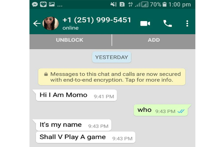 কিশোরীর অভিযোগ, এর তিন মিনিটের মধ্যেই তাঁর হোয়াটসঅ্যাপে +1(251)999-5451 নম্বর থেকে একটি মেসেজ আসে। নিজেকে মোমো বলে পরিচয় দেয় ওই নম্বর। কিশোরীও পাল্টা হোয়াটসঅ্যাপ করে জানতে চান যে সে কে? তাতে ইংরেজিতে উত্তর আসে, ‘ইটস্ মাই নেম/ শ্যাল উই প্লে অ্যা গেম’ অর্থাৎ এটা আমার নাম... আমরা কি একটা গেম খেলব।