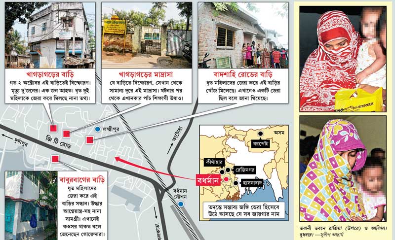 পুলিশ সূত্রে জানা গিয়েছে, মঙ্গলবার দুপুরে গাড়িতে করে বর্ধমান মেডিক্যালে স্বাস্থ্যপরীক্ষা করাতে নিয়ে যাওয়া হয়েছিল রাজিয়া ও আলিমাকে। বাবুরবাগ এলাকার উপর দিয়ে যাওয়ার সময়ে আলিমার চোখমুখের ভাব দেখে পুলিশের সন্দেহ হয়। তখনই দু’টি জায়গার নাম উঠে আসে বাবুরবাগ ও বাদশাহি রোডের মাঠ। পুলিশ জানতে পারে, বাবুরবাগে হাজি রেজ্জাক মোল্লার (এখন আটক) বাড়িতে গত দু’মাস ধরে দু’জন মহিলা ও দু’জন পুরুষ ভাড়া ছিল। ঘনবসতিপূর্ণ এলাকায় ওই দোতলা বাড়িটির একতলায় কিছু ছাত্র ভাড়া থাকেন। উপরে থাকত ওই চার জন। খাগড়াগড়ের মতো এখানেও দুই মহিলা সব সময় বোরখা পরে থাকত।