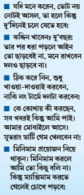 রাজ্য জুড়ে সমস্ত পুরসভার তৃণমূল কাউন্সিলরদের শুক্রবার কলকাতায় এক কর্মশালায় ডেকেছিলেন তৃণমূল নেত্রী। দলীয় সূত্রের খবর, সেখানেই এ দিন তাঁদের স্পষ্ট বার্তা দিয়ে মমতা বলেন, যদি মনে করেন, ভোট নয় নোটই আসল, তা হলে কিন্তু দু’দিনেই চলে যেতে হবে! কেন চলে যেতে হবে, তা ব্যাখ্যা করে এর পরই দলনেত্রী কঠিন গলায় বলেন, কারণ কদ্দিন খাবেন? দু’বছর! তার পর ধরা পড়লে আইন তো ছাড়বেই না, মনে রাখবেন দলও ছাড়বে না। তাই কাউন্সিলরদের মমতা বলেছেন, ঠিক করে নিন, শুধু খাওয়া-দাওয়াই করবেন, নাকি লং টার্মে দলটা করবেন!