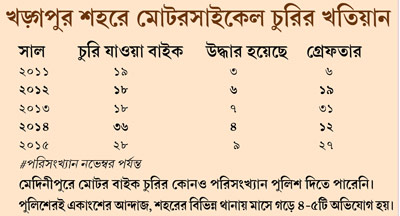 পুলিশেরই এক সূত্রে খবর, আগে ধরা পড়া চোরচালানচক্রের সঙ্গে জড়িতদের জেরা করে জানা গিয়েছে, মেদিনীপুর শহরে বাইক চুরির সঙ্গে জড়িত দুষ্টচক্রের সংখ্যা তুলনায় কম। খড়্গপুর শহর এবং খড়্গপুর গ্রামীণ এলাকায় সংখ্যাটা বেশি। চন্দ্রকোনা রোড এলাকাতেও হাত রয়েছে ওই সব চক্রের।