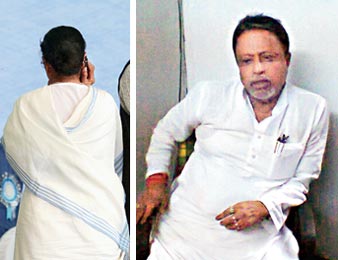 এই ফোনের পরেই মেজাজ বদল মমতার (বাঁ দিকে)। মধ্যমগ্রামে দলের দফতরে মুকুল। নিজস্ব চিত্র।