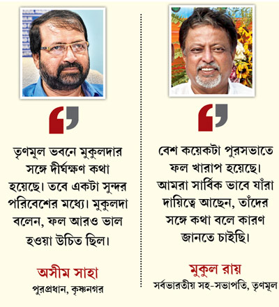 দলীয় সূত্রে জানা গিয়েছে অসীমবাবুকে স্পষ্টই জানিয়ে দেওয়া হয়েছে, কোনওক্রমে গ্রাম থেকে ‘ম্যানাজ’ করেই মান রক্ষা করা হয়েছে ওই আসনগুলিতে। এক শীর্ষ নেতার কতায়, ‘‘মুকুল সরাসরি কৃষ্ণনগরের পুর প্রধানের কাছে জানতেও চান, ‘শহরে কেন এমন খারাপ ফল হল? তুমি কি তাহলে আদৌ কোনও কাজ করতে পার নি।’’