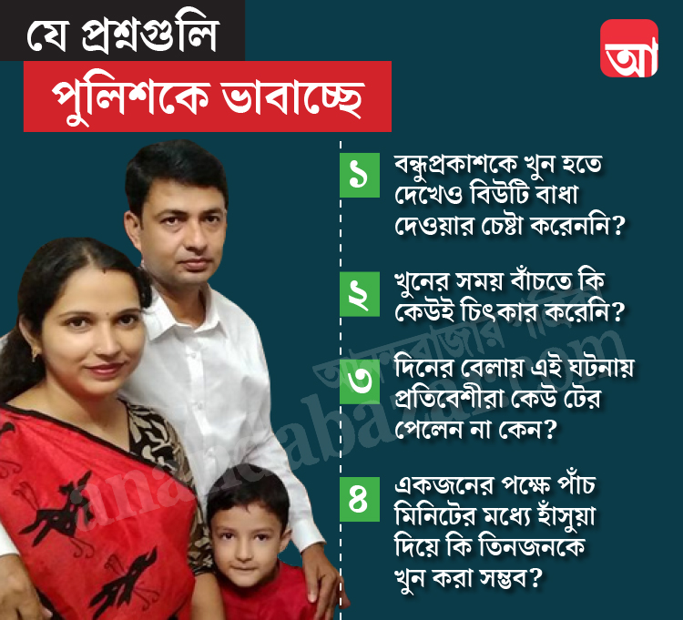 দিনের বেলায় তিন জনকে পর পর কুপিয়ে খুন করা হল, কিন্তু কেউ কোনও চিৎকার শুনতে পেলেন না কেন, এটাও ভাবাচ্ছে তদন্তকারীদের। বন্ধুপ্রকাশকে গলায় হাঁসুয়া চালিয়ে খুনের সময় বিউটি কোথায় ছিলেন, কী করছিলেন, সেটাও এ বার জানার চেষ্টা করছে পুলিশ। বিউটি কি বাধা দেওয়ার চেষ্টা করেননি? চিত্কার করেননি? না করলে কেন? পাঁচ বছরের ছেলে স্বাভাবিক ভাবেই কেঁদে ওটার কথা। কিন্তু প্রতিবেশীরা কোনও আওয়াজই শুনতে পাননি। কেন? এই ধরনের অনেক প্রশ্নেরই উত্তর এখনও অস্পষ্ট হয়ে রয়েছে পুলিশের কাছে।