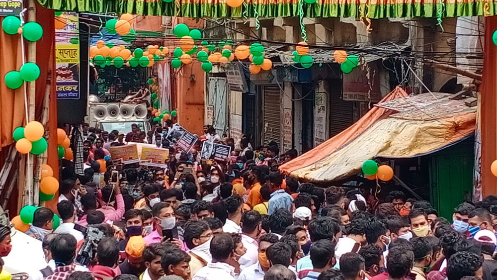 মিছিল শুরু হওয়ার আগে বিজেপি রাজ্য দফতরের সামনে সমর্থকদের ভিড়। ছবি: প্রসেনজিৎ দাস