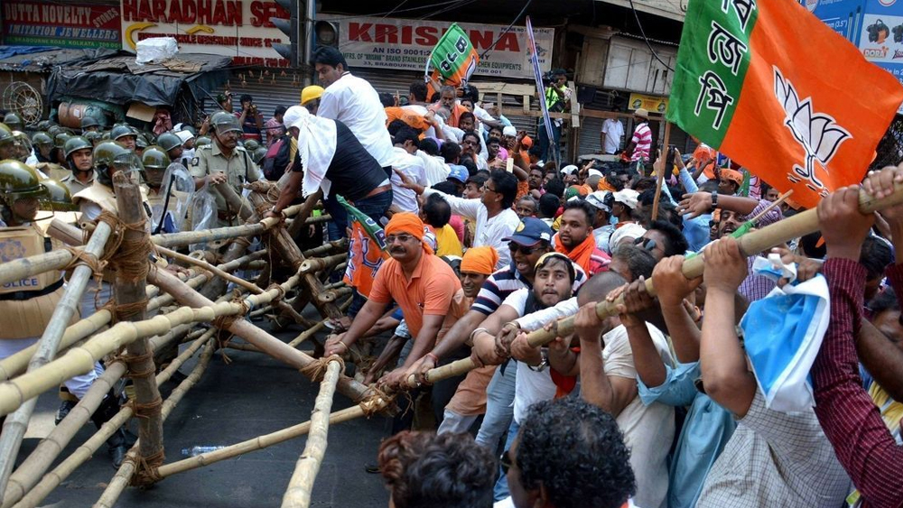 ব্রাবোর্ন রোডে ব্যারিকেড ভাঙার চেষ্টা বিজেপি কর্মী-সমর্থকদের। ছবি: বিজেপির টুইটার থেকে