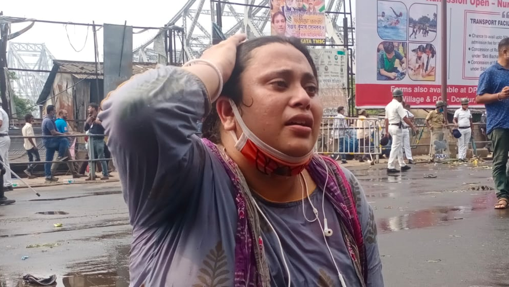 শর্মিষ্ঠা দাস ঘটক, জগদ্দলের বিজেপি কর্মী। আহত হয়ে সঙ্গীদের খোঁজে হাওড়া ব্রিজের সামনে ছবি: প্রসেনজিৎ দাস