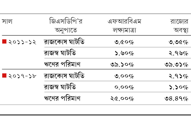 অর্থ কর্তারা জানাচ্ছেন, এ রাজ্যে ২০১০ সালে ফিসকাল রেসপন্সিবিলিটি অ্যান্ড বাজেট ম্যানেজমেন্ট (এফআরবিএম) আইন চালু হয়েছিল। সেই আইনে ঋণভার এবং ঘাটতি কমাতে সরকার কী কী পদক্ষেপ করবে, তা বলা হয়েছিল। ২০১৪-১৫ পর্যন্ত নির্দিষ্ট লক্ষ্যমাত্রা নিয়ে ফি বছর বাজেট তৈরি করতে হয়েছিল রাজ্যকে। বাজেট নিয়ন্ত্রণ আইনের মেয়াদ শেষ হয়ে গেলেও চতুর্দশ অর্থ কমিশন ২০১৫-১৬ থেকে ২০১৯-২০ পর্যন্ত সেই ধারা বজায় রেখেই ঘাটতি নিয়ন্ত্রণের পথে হাঁটতে বলেছিল রাজ্যগুলিকে। সব রাজ্যের জন্য একই আর্থিক সূচকের লক্ষ্যমাত্রা দিয়েছিল অর্থ কমিশন। এ বার পঞ্চদশ অর্থ কমিশন পরের পাঁচ বছর রাজ্যগুলির জন্য নয়া আর্থিক সূচকের লক্ষ্যমাত্রা বেঁধে দিতে পারে। তার আগেই রাজ্য বলেছে, সবার জন্য এক সূচক যথাযথ নয়।