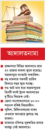 আদালত সূত্রে জানা গিয়েছে, কৃষ্ণনগর জেলা জজ আদালত ও নিম্ন আদালতে এজলাসের সংখ্যা বাড়ানো হয়েছে। কিন্তু তারপরেও কৃষ্ণনগর জেলা জজ আদালত, নিম্ন আদালত-সহ নানা বিষয়ের বিশেষ আদালত মিলিয়ে ২০১৪ সালের ডিসেম্বর মাস পর্যন্ত প্রায় ৪২ হাজার মামলা ঝুলে রয়েছে। পড়শি জেলা মুর্শিদাবাদের সদর শহর বহরমপুরে সেই সংখ্যাটা দ্বিগুণেরও বেশি। জমা মামলা এক লক্ষ ছাড়িয়েছে, বলছেন আইনজীবীরা।