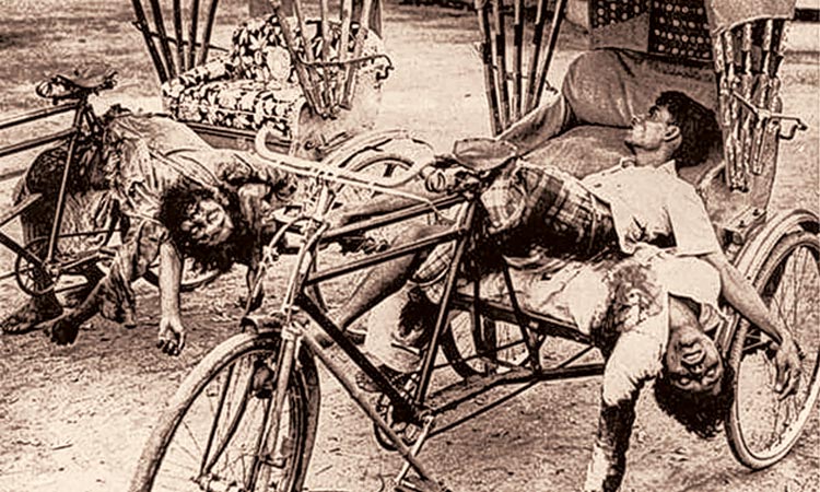তার পর? বুড়ো আঙুলে উঠোনের মাটি খুঁটে তোলার ফাঁকে অশ্বিনী কর্মকার বলছেন, ‘‘ওই যে বললেন, ফট ফট...এক টানা আওয়াজ আর ঝরা পাতার মতো টুর টুপ করে পড়ে মরে গেল আমাদের আস্ত পরিবারটা। এগারোটা লোক, ভাবতে পারেন!’’ সেই ছেলেবেলাটা এখনও ধরা আছে অশ্বিনীর। চাঁপাই নবাবগঞ্জের সেই বাড়িটাও মনে আছে তাঁর। আগুন, ধোঁয়া, কান্না, ভয়— সব কেমন মিলেমিশে একাকার হয়ে আছে, আজও।