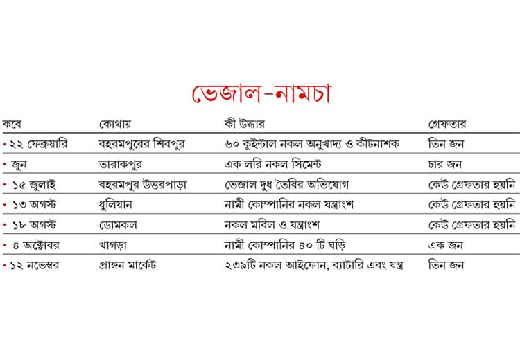 গত এক বছরে মুর্শিদাবাদের বিভিন্ন এলাকা থেকে বেশ কিছু ভেজাল সামগ্রী উদ্ধার করা হয়েছে। ধরাও পড়েছে বেশ কয়েক জন।