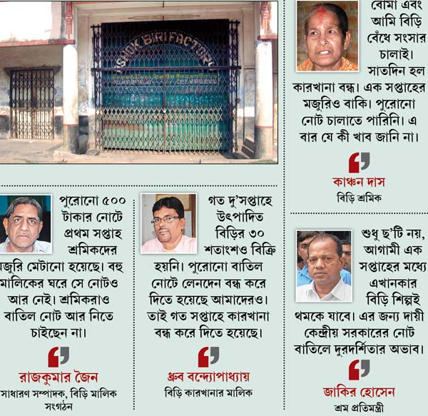 মাদার ইন্ডিয়া বিড়ি কারখানার ম্যানেজার ধ্রুব বন্দ্যোপাধ্যায় বললেন, ‘‘গত দু’সপ্তাহে উৎপাদিত বিড়ির ৩০ শতাংশও বিক্রি হয়নি। পুরোনো বাতিল নোটে লেনদেন বন্ধ করে দিতে হয়েছে আমাদেরও। তাই গত সপ্তাহ থেকেই কারখানা বন্ধ করে দিতে হয়েছে।’’