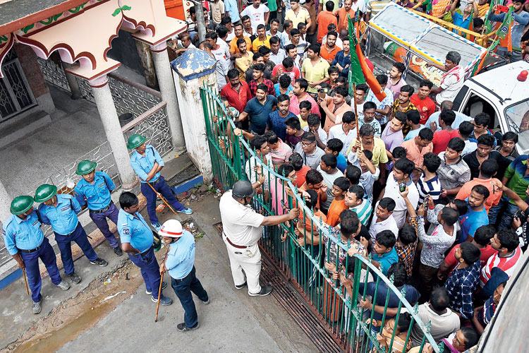 কৃষ্ণ দেবনাথের দেহ নিয়ে নবদ্বীপ থানার সামনে বিক্ষোভ বিজেপির। শনিবার। ছবি: সুদীপ ভট্টাচার্য