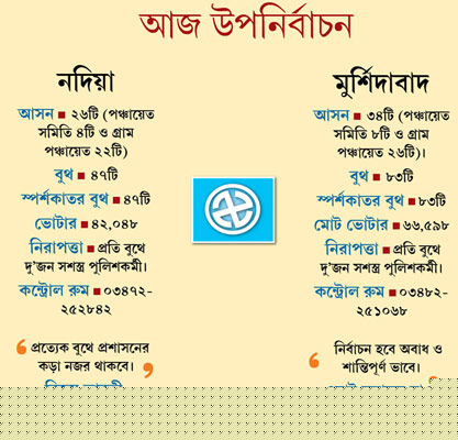 সকাল সাতটা থেকে বিকেল পাঁচটা পর্যন্ত ভোটের সময়সীমা নির্দিষ্ট করেছে নির্বাচন কমিশন। দুই জেলায় এই ভোটের প্রেক্ষাপট হিসেবে রয়েছে, কান্দিতে দিনের আলোয় দিশি পিস্তল উঁচিয়ে নাচ থেকে শুরু করে কল্যাণীর সগুণা-গয়েশপুর থেকে সিআইডি-র অস্ত্র উদ্ধার। তৃণমূলের নানা গোষ্ঠীর কোন্দল থেকে শুরু করে রাজনৈতিক দলগুলির মধ্যে প্রতিযোগিতা তো আছেই। সে পরিস্থিতির কথা বিবেচনা করে তাৎপর্যপূর্ণ ভাবে দুই জেলার প্রতিটি আসনকেই স্পর্শকাতর হিসেবে চিহ্নিত করেছে প্রশাসন।